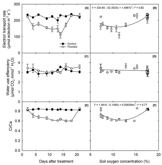 Influence of waterlogging on soybean plants: (A) electron transport rate (ETR), (C) water use efficiency (WUE), (E) ratio of internal and external CO2 concentration (Ci/Ca) measured during the waterlogging treatment, and (B) photosynthesis, (D) water use efficiency, and (F) ratio of internal and external CO2 concentration (Ci/Ca) expressed as a function of soil oxygen concentration using both the treatments data. Each value is the mean of 15 measurements and S.E. (n = 15). The arrow indicates the day flood treatment stopped, and the recovery period started.