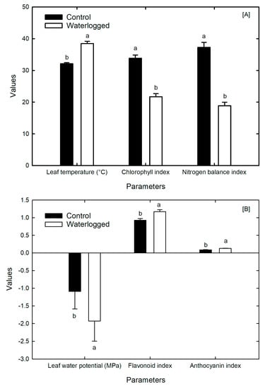 Waterlogging also created a nitrogen deficiency condition, increasing the flooded plants’ flavanol concentration. The leaf water potential in the control plants was −1.1 MPa, compared to approximately −2.0 MPa in the waterlogged plants. Although there was a negligible difference between the anthocyanin index of both control and flooded plants (Figure 4B), the flavanol index in waterlogged soybean plants was approximately 1.3 compared to 0.9 in control plants.
