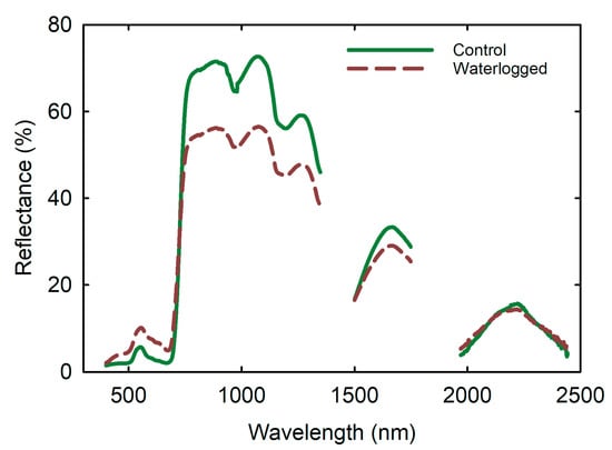 The transition from low reflectance in the PAR, blue, green, and red regions, to high reflectance in the near-infrared, tissue, and water band regions observed in waterlogged soybean leaves is remarkable (Figure 6A,B). This shift, known as the “red edge,” is influenced by changes in chlorophyll content, leaf area index (LAI), biomass and hydro status, age, stress factor, and seasonal patterns [30]. The shortwave infrared region of the hyperspectral reflectance in Figure 6 includes the three absorption spectra of water (1400–1500 nm, 1900–2000 nm, and 2450–2500 nm).