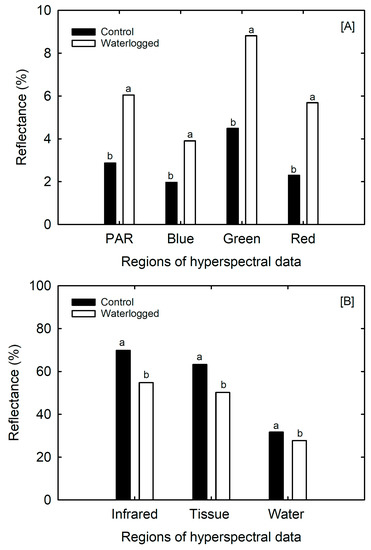 Effect of waterlogging on regions of the hyperspectral curve of soybean leaf, (A) PAR = 400–700 nm, blue = 400–520 nm, green = 520–600 nm, and red = 630–690 nm) and (B), infrared = 760–900 nm, tissue = 900–1350 nm, and water = 1600–1850 nm, associated with leaf physiological characters. Data are mean ± S.E. (n = 15). The lowercase letters indicate a significant difference at p < 0.05.