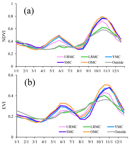 - Didan, K.; Munoz, A.B. MODIS Vegetation Index User’s Guide (MOD13 Series); Vegetation Index and Phenology Lab, The University of Arizona: Tucson, AZ, USA, 2019. Available online: https://lpdaac.usgs.gov/documents/621/MOD13_User_Guide_V61.pdf (accessed on 28 December 2022).