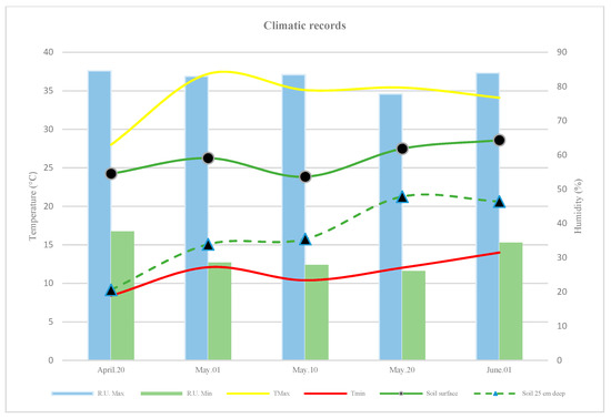 During the experiment, climatic conditions were stable over the whole cultivation season, with the relative humidity of the air ranging from a minimum of 30% to a maximum of 80% (Figure 2). The night and day shift in air temperature during the growing period varied from 3 °C to 18 °C at night and from 22 °C to 46 °C during the daytime (Figure 2). Concerning the soil temperatures, at 25 cm of depth, the temperatures ranged from a minimum of 7.8 °C (Tmin) to a maximum of 29.4 °C (Tmax), while on the surface, at 5 cm of depth, it ranged from a minimum of 18.8 °C (Tmin) to a maximum of 46.1 °C (Tmax), as shown on Figure 1. Concerning the relative humidity (R.U.) of the soil, it varied from 11 to 54% and from 63 to 93% for the minimum and the maximum R.U., respectively (Figure 2). The greenhouse temperature was maintained on a range between 10 °C Tmin and 35 °C Tmax (Figure 2) by opening or closing both the windows and doors.