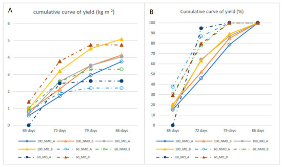Yield cumulative curves. (A) yield of all harvest expressed in kg m−2; (B) percentage of yield collected per harvest.