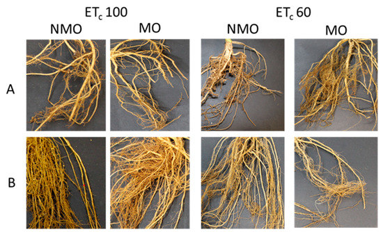 Details of roots and nodules among the thesis. Differences in nodulation can be observed between the two different irrigation regimes (ETc 100 and ETc 60), by application of PGPMs (MO or NMO) and between the two genotypes of snap bean adopted: Domino (A) and Maxi (B).