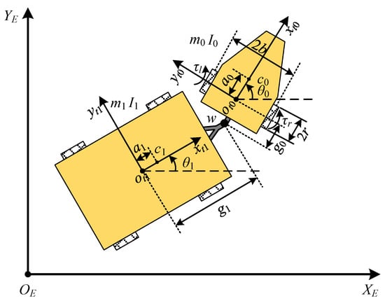 where τd represents the unknown nonlinearity vector caused by external disturbances, ground friction, and so on; Ma1 represents the symmetric positive definite inertia matrix; Ca1 represents the matrix of centripetal force and Coriolis force; Da1 represents the matrix of damping and viscous friction coefficient; Ba1 represents the input transformation matrix; and τ = [τl, τr]T represents the input torque vector. To simplify the design, an on-axle hitching tractor-trailer (g0 = 0) is considered. Based on [3], the dynamic matrices are selected as follows: