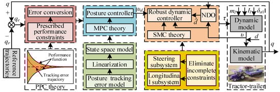 For a robot with simple structure, it is easy to obtain the analytical solution of the kinematic and dynamic models and achieve accurate and stable trajectory tracking control. However, it is difficult or even impossible to obtain the accurate kinematic and dynamic models in practical application because of the complex mechanical structure of the tractor-trailer and various uncertain disturbances. The past control methods have many disadvantages, such as complex control laws and high requirements for model accuracy. To solve these problems, a robust trajectory tracking control algorithm with double closed-loop structure is proposed, as shown in Figure 2. The PPC method uses a prescribed performance function to constrain deviations from the desired trajectory within a specified range. Combined with the posture tracking error model, the MPC method is selected to construct the posture controller. Then, the robust dynamic controller is designed based on SMC and NDO. Through the methods proposed in this paper, the posture tracking and driving torque control of the tractor-trailer can be realized simultaneously.
