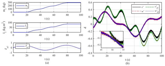 Figure 4. Disturbance observation curves of the tractor-trailer considering the model parameter changes: (a) the change curves of model parameters; (b) the observation curves of system disturbances.