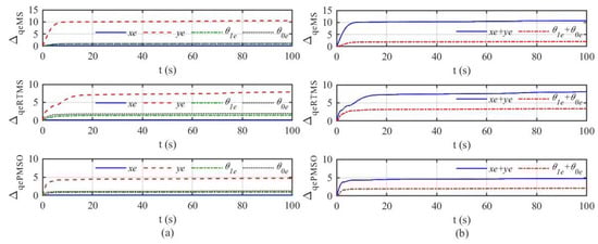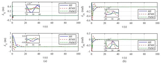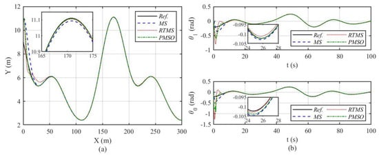 According to the reference trajectories shown in Equations (35) and (36), the trajectory tracking control results of the tractor-trailer are shown in Figure 5. It can be seen from the position control curves in Figure 5a that the three control methods (MS-Ref. [9], RTMS-Ref. [5], PMSO-this paper) can successfully achieve high-precision trajectory tracking control, but the method proposed in this paper has the fastest response speed. In Figure 5b, the heading tracking control errors of the control method in Ref. [9] is the smallest at the beginning, but the response speed is the slowest. The Ref. [5] and the method proposed in this paper have faster response speed, but have larger tracking error at the beginning, and the tracking error of the method proposed in this paper is smaller.