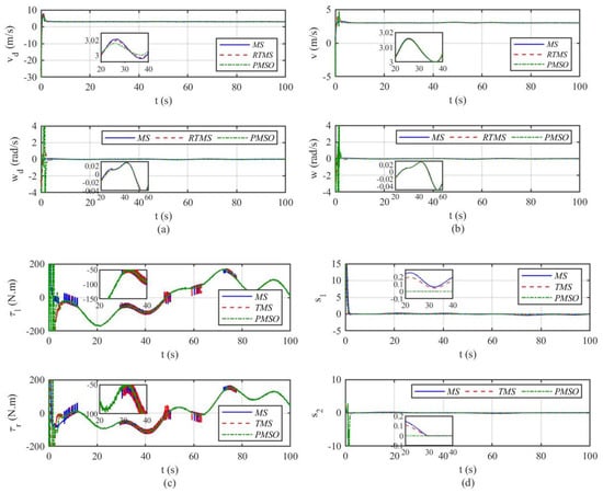 The control quantities of the posture controller and dynamic controller of the tractor-trailer are shown in Figure 8. Figure 8a shows the control outputs of the posture controller. It can be seen from Figure 8a that the method proposed in this paper has changed greatly in the initial stage compared with the methods in Refs. [5,9], because the tractor-trailer has large initial trajectory tracking errors. In order to meet the prescribed transient and steady-state performances, the prescribed performance function used in this paper will restrict the tracking error, which leads to this phenomenon. However, when the trajectory tracking control reaches the stable stage, the method proposed in this paper shows better robustness and steady-state performance. Figure 8b shows the actual speed and angular speed of the tractor-trailer based on the three control methods (MS-Ref. [9], RTMS-Ref. [5], PMSO-this paper). Figure 8c shows the control outputs of the dynamic controller. It can be seen that compared with the traditional sliding mode reaching law in Ref. [9], the control output curves of the proposed fast power reaching law with second-order sliding mode characteristics are smoother and achieve the purpose of reducing chattering. Figure 8d shows the sliding mode surfaces of the dynamic controller.