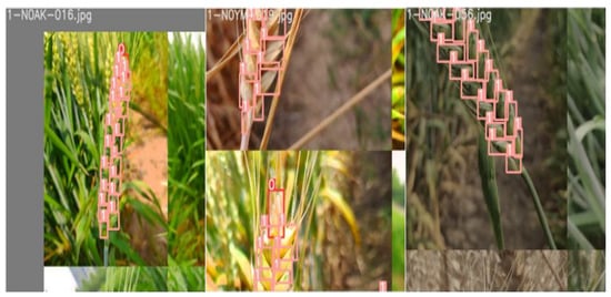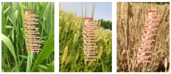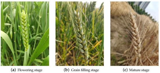 The wheat ear images used in this study were collected from the experimental field (113°8 E, 34°13 N) at the Xuchang Campus of Henan Agricultural University, which covers an area of 3300 m2. The sampling time was from 8:00 a.m. to 10:00 a.m. from 22 April 2021 to 28 May 2021. The wheat ears were randomly selected from the field for sampling. The images obtained cover the flowering, grain filling, and maturity stages with an approximate ratio of 1:2:2. The wheat varieties collected were AK58, Xinong, Yumai49, and Zhoumai27. Sideview images of the wheat ears were taken with an image resolution of 3024 × 4032 pixels in JPG format. A couple of typical samples of the dataset are shown in Figure 1.