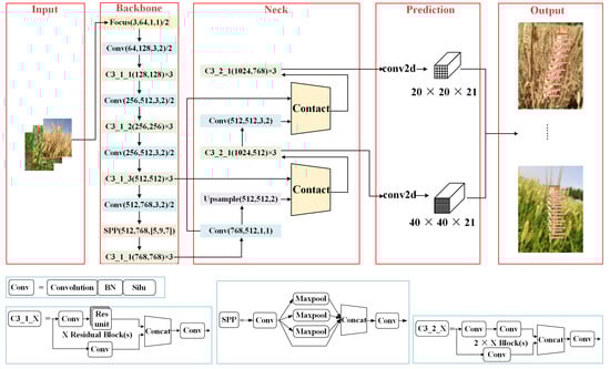 After filtering and sorting the collected wheat spikelet images, 1750 images were finally obtained. Since there are some morphological differences between the spikelets on the head of the wheat ears and those on the main ear body, the spikelets were divided into two categories: spikes and spikelets. The labelImg https://github.com/tzutalin/labelImg (accessed on 15 January 2023) tool was used for image labeling, and a txt label file in YOLO format was generated. An example of data labeling is shown in Figure 2. The wheat spikelet dataset was randomly divided into a training set, a validation set, and a test set at a ratio of 8:1:1, and 1398 images were used for the training set, 176 images for the validation set, and 176 images for the test set.