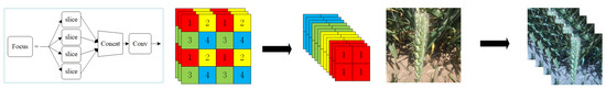 Backbone: The backbone consists of four parts: the C3 structure, the Conv module, the SPP structure, and the focus structure. The C3 structure enhances the learning ability of convolutional neural networks and is simplified from the cross stage partial net (CSPNet) [34] structure. The number of repetitions of the C3 module is reduced to half of that of the original number. The Conv module is used for sampling and feature splicing. In this study, the number of output convolutional channels before the SPP structure was decreased by 256 compared with that of the original number. The SPP structure aims to use local features and global features. The main task of the focus structure was to split the adjacent pixels of the original image. The original three-channel input was expanded four times to twelve channels, and a twofold downsampling feature map was obtained through a convolution operation. The specific slicing operation is shown in Figure 5.
