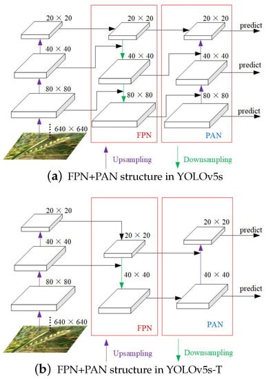 Neck: The system’s neck is a combination of a feature pyramid network (FPN) and a pixel aggregation network (PAN). The FPN transmits the feature information of the upper layer to the lower layer for fusion through top-down upsampling. PAN splices the strong positioning features from the lower layers to the upper layers through bottom-up downsampling. This design can effectively strengthen the integration capability of network features. The specific structure is shown in Figure 6.