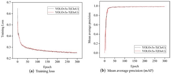 The model was trained by the spikelet dataset proposed in Section 2.1 under the same computational platform and parameter configuration. In Figure 7, the convergence process of the training is first investigated. In general, YOLOv5s-T(CIoU) and YOLOv5s-T(EIoU), as well as the model mAP, performed quite similarly in terms of the training convergence process. In Figure 7b, the training loss gradually converges to less than 0.3 after tens of epochs and flattens after reaching 50 epochs. Correspondingly, the change in the mean average precision with training is shown in Figure 7a. When the training converges, the mean average precision is stable at approximately 98%. This indicates that, after sufficient training, the proposed model in this paper can achieve a promising detection performance.