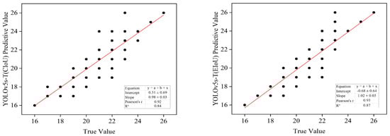 In Figure 9, a linear fit was performed on the predicted and true values of YOLOv5s. The was 0.89. Then, this was used as a criterion for the evaluation of YOLOv5s-T. In Figure 10, the same statistical approach was used for YOLOv5s-T(CIoU) and YOLOv5s-T(EIoU). Furthermore, the specific performances of YOLOv5s, YOLOv5s-T(CIoU), and YOLOv5s-T(EIoU) with respect to parameters , MAE, and RMSE are shown in Table 3. As seen in Figure 10 and Table 3, the YOLOv5s-T(EIoU) algorithm is closer to YOLOv5s and better than YOLOv5s-T(CIoU) among these metrics. In general, both YOLOv5s and YOLOv5s-T achieved a favorable performance in terms of MAE and RMSE, which indicates that the proposed method of this study can effectively achieve low-error wheat spikelet counting.