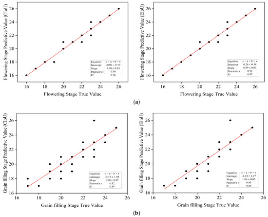 To further analyze the effect on different fertility stages of the proposed wheat spikelet counting method, in this study, the images in the test set were divided according to the fertility stages. Specifically, there were 36 images of the flowering stage, 75 images of the filling stage, and 65 images of the maturity stage. The linear regression method fit the spikelet counting values with manual statistics and model predictions from a single wheat image of each fertility stage. The fitting results are shown in Figure 11, and the performance metric results are shown in Table 4.