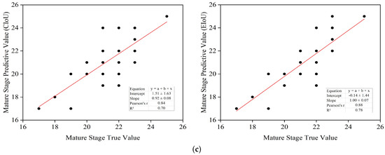 Fitting results of the number of spikelets in images of each growth stage (a) of YOLOv5s-T(CIoU) and YOLOv5s-T(EIoU) in the flowering stage, (b) of YOLOv5s-T(CIoU) and YOLOv5s-T(EIoU) in grain filling stage, (c) of YOLOv5s-T(CIoU) and YOLOv5s-T(EIoU) in the mature stage.