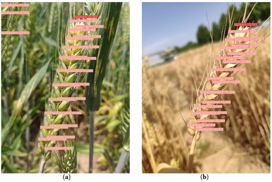This study focused on counting the number of spikelets per spike. Therefore, during the dataset construction, other wheat ears were separated from the photographed wheat ear as much as possible. However, some spikelets in the background were still detected, as shown in Figure 12a, which caused interference in the counting results and increased the statistical error. In addition, we found that spikelet shape is another important influencing factor. The spikelets at the flowering stage were relatively closely arranged and less shaded, although they were heavily adhered. Hence, the counting accuracy in this period is higher than that in the filling and maturity stages. The spikelets at maturity changed their morphology due to the expansion of the seeds and further intensified the tightness of the spikelet arrangement, as shown in Figure 12b. This resulted in a gradual decrease in counting accuracy from flowering to filling and then to maturity.