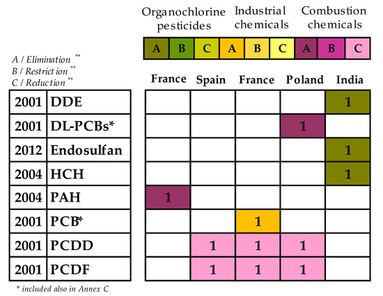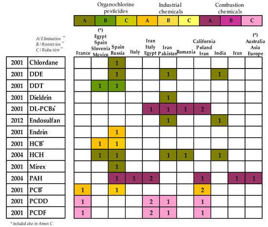 Regulations addressing the persistent organic pollutants have aimed at reducing the consequences of pollution, eliminating existing pollutants or preventing potential contamination [40]. According to the European Chemical Agency [41], at least 12 types of organic substances, the so called “dirty dozen”, were included, in 2001, under the Listing of POPs in the Stockholm Convention (Table 1). The Convention aimed to protect human health and the environment, especially by safely eliminating, reducing the production and decreasing use of the 12 dangerous substances and was signed, in the beginning, by 115 states. Currently, the Stockholm Convention is signed by 152 states and ratified by 184 states [41]. The list of banned or restricted organic pollutants currently reaches about 28 hazardous chemicals [42] and includes three categories of POPs distinguished by their originating anthropogenic process [12,40,43].