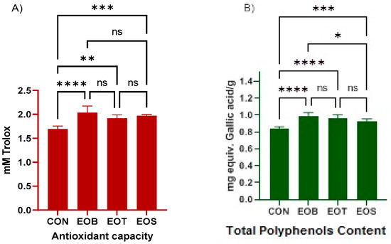 Effect of dietary EO supplement on (A) antioxidant capacity and (B) total polyphenols content determined in thigh meat samples. CON—control diet; EOB—diet containing 0.05% essential oil of basil; EOT—diet containing 0.05% essential oil of thyme; EOS—diet containing 0.05% essential oil of sage; ns—not significant. * p < 0.05, ** p < 0.001, *** p < 0.0001, **** p < 0.00001.