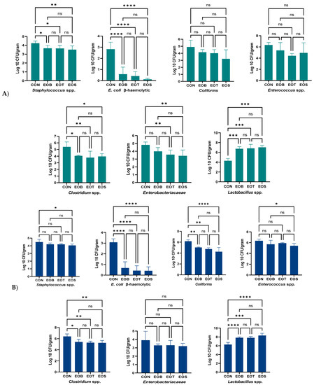 Effect of dietary EO supplements on the intestinal microbiota of broiler chickens determined from (A) small intestine segment and (B) caecum segment. The results are expressed as (Log10 CFU/g). CON—control diet; EOB—diet containing 0.05% essential oil of basil; EOT—diet containing 0.05% essential oil of thyme; EOS—diet containing 0.05% essential oil of sage. * p < 0.05, ** p < 0.001, *** p < 0.0001, **** p < 0.00001. ns—not significant.