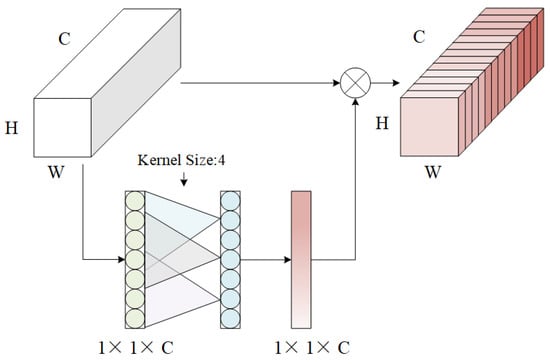 Figure 3 depicts the particular network topology of SE. Squeeze, Excitation, and Scale make up the bulk of the attention mechanism module [16,17]. The SE attention mechanism was inserted into the Res2Net50 residual block with the following basic principle: The SE module receives the feature map from the residual block, assuming that the dimensions of the input feature map are C × H × W, where C is the number of channels and H and W are the height and width of the feature map, respectively. The SE module first performs a global average pooling (GAP) operation on the input feature map, and the size of the feature map becomes 1 × 1 × C after GAP. The SE module uses a fully connected layer to reduce the number of channels of the feature map after GAP by a dimensionality reduction ratio of r (typically, r = 16). Therefore, the first fully connected layer has an input size of 1 × 1 × C and an output size of 1 × 1 × (C/r). The SE module then uses another fully connected layer to restore the channel count of the feature map to the original channel number C. Therefore, the second fully connected layer has an input size of 1 × 1 × (C/r) and an output size of 1 × 1 × C. Finally, the output of the SE module (i.e., channel attention weight) is multiplied channel-by-channel with the input feature map. This allows the model to focus on more important channel features, which improves the performance of the model. The size of the output feature map is the same as the input feature map, that is, C × H × W.