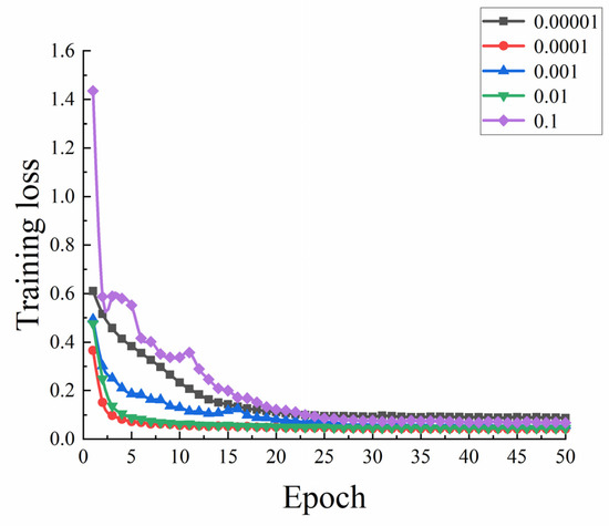 The initial learning rate in the Adam optimization algorithm must have a desirable value. Model convergence issues will result from setting the learning rate too low; while, if it is set too high, the model will not only fail to converge but also have the loss function miss the ideal solution. To compare the training effect of the model, parameter values of various orders of magnitude are used. For model training, learning rates of 0.1, 0.01, 0.001, 0.0001, and 0.00001 were chosen, with a batch size of 16. Figure 5 depicts how various learning rates affect the loss value.