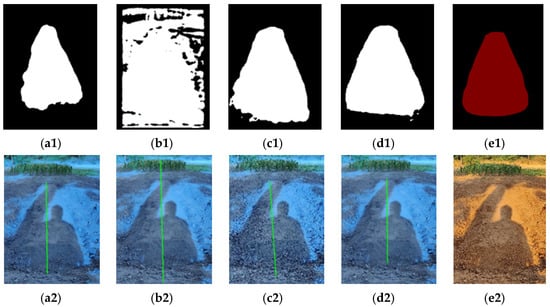 Outcome Prediction. (a1) Unet prediction mask. (b1) VGG prediction mask. (c1) Res2net50 pre-diction mask. (d1) Our model prediction mask. (e1) Label. (a2) Unet model navigation line fitting. (b2) VGG model navigation line fitting. (c2) Res2net50 model navigation line fitting. (d2) Our model model navigation line fitting. (e2) Original.