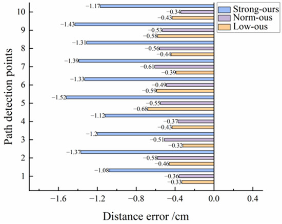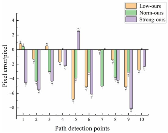 Figure 10 and Figure 11 show the difference between the optimization model and the Unet model in pixel error and distance error respectively. Table 4 and Table 5 show the experimental data of the optimized model and the Unet model under different illumination, respectively. From Figure 7, it can be seen that the Unet model is the closest to the algorithm in this paper in terms of prediction results, so it is chosen as the error control group experiment for comparison. From the data in the table, it can be concluded that the distance errors of the optimized model under low light, normal light, and high light are 0.75 cm, 0.71 cm, and 0.80 cm, respectively, with an average distance error of 0.76 cm, and the distance errors of the Unet model are 1.22 cm, 1.20 cm, and 1.21 cm, respectively, with an average distance error of 1.21 cm. Combined with Figure 9 and Figure 10, it can be concluded that the distance error of the optimized model under various illuminations is generally smaller than that of the Unet model, which can be adapted to various illumination environments. Second, the variance in the distance error of the optimized model is 0.11, 0.05, and 0.09 under low light, normal light, and high light, respectively, and the variance in the distance error of the Unet model is 0.18, 0.11, and 0.15 under the same conditions. Overall, the distance error of the Unet model fluctuates more sharply under different light conditions, which proves that it is not robust under different light conditions. However, the differences in distance errors of the optimized model compared to the Unet model are 0.47, 0.49, and 0.41. This indicates that the optimized model in this paper can better resist the influence of illumination under different lighting environments, and the overall error fluctuation range is small with good robustness. It can be concluded that changes in light intensity have little effect on this model, which is suitable for monopoly row operation in the field.
