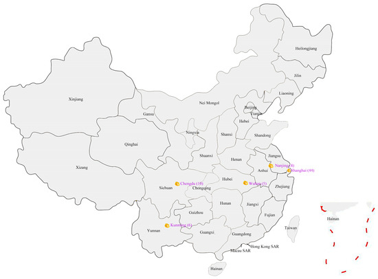 Distribution of sampling sites. Purple font represents sampling sites, and number of samples are indicated in parentheses. Black font represents the name of the provincial capital.