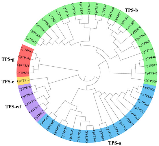 3.1. Phylogenetic Analysis of CpTPS Proteins