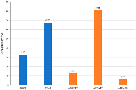 The 146 SSRs were discovered from 44 CpTPS sequences (each sequence included a 2000 bp promoter gene and 2000 bp sequence of the 3′ UTR area) (Supplementary Table S1), accounting for 84.62% of the overall sequences. In total, 35 of the 44 sequences had multiple SSRs. Also, 17 SSRs present in compound formation were detected (Table 2). The 2000 bp promoter regions contained 32 SSRs, the gene regions contained 82 SSRs, the post-2000 bp sequences contained 15 SSRs, and CpTPS23 contained the most SSR sites, of which only one SSR (19-CDs) in CpTPS19 was located in the CDs region (Supplementary Table S1) Among all the SSR types, dinucleotide repeats were the most abundant (67.12%), followed by trinucleotide repeats (32.19%), while there was only one SSR with a pentanucleotide repeat. SSRs with 5 (23.97%) and 6 (26.03%) sequence repetitions were the most abundant. The number of sequence repetitions was 41 (Table 3). The AT/AT type was the most common (67.35%) among the dinucleotide repeated sequences, followed by AG/CT (32.65%). AAT/ATT was the most frequent trinucleotide repeat (80.85%), followed by AAG/CTT (12.77%) and ATC/ATG (6.38%) (Figure 3).