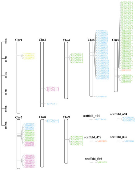Chromosomal location of CpTPSMSs. Names of makers are shown on the right side of the chromosome. Blue, green, yellow, purple and orange indicate that CpTPSMSs were from the TPS-a, TPS-b, TPS-c, TPS-e/fand TPS-g subfamilies, respectively.