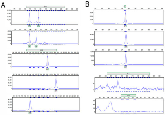 We screened 103 SSRs from 146 CpTPSMSs and designed primers. These primers were amplified in six wintersweet samples (H29, HLT040, HLT053, SW, XL003 and YZH). The results of capillary electrophoresis showed that most SSR primers had a poor amplification effect (Figure 5). In total, 13 pairs of primers had no amplification products in three or more samples, 35 pairs of primers had no polymorphism or poor polymorphism, 22 pairs of the primer amplification products could not be determined, and 33 SSR primers had obvious amplification bands and good polymorphism. The 33 polymorphic markers generated 108 SSR variants, and each range was 2–6, with an average of 2.91 SSR variations per marker. Meanwhile, the effective allele range was 1.41–6, with an average of 2.36 per locus (Table 4 and Table S2). The expected heterozygosity was 0.32–0.91 (an average of 0.58), the observed heterozygosity was 0–0.67 (an average of 0.20), and the expected heterozygosity was higher than that which was observed. The range of the polymorphism information content (PIC) value was 0.27–0.81, with an average of 0.46. In total, 13 CpTPSMSs were highly polymorphic (PIC > 0.5), CpTPSMS03-2, CpTPSMS43-1 and CpTPSMS47-1 were from CpTPS genes of the TPS-b subfamily, CpTPSMS06-3, CpTPSMS06-4, CpTPSMS12-2 were from CpTPS genes of the TPS-e/f subfamily, and CpTPSMS10-2 was from the CpTPS gene of the TPS-c subfamily (Figure 4).
