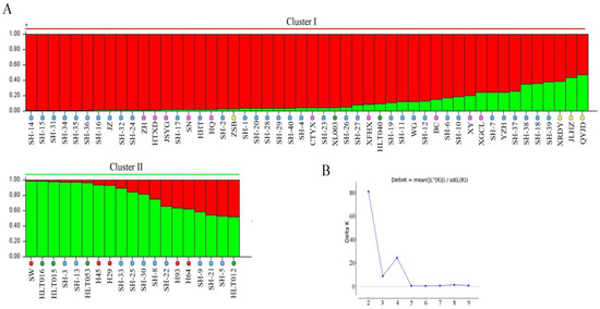 We collected 69 wintersweet cultivars and genotypes from Wuhan, Kunming, Nanjing, Chengdu and Shanghai, which were the main places of origin of wintersweet in China. The DNA of these samples was amplified using 33 SSR primers with good polymorphism. The polymorphism of the amplified products was detected by capillary electrophoresis, which found that 26 pairs of SSR primers had a good amplification effect in 69 samples. The structure of the 69 samples was analyzed by the STRUCTURE software. The hierarchical island model revealed that the ΔK reached the highest peak at K = 2, and the 69 wintersweet cultivars and genotypes were grouped into two groups (Figure 6). Cluster I and Cluster II had Q values ranging from 0.56 to 0.99 and 0.50 to 0.99, respectively. There were 50 cultivars and genotypes (72.46%) with a Q score greater than 0.8, suggesting that their genotypes are pure lines, while suggesting that the other 19 cultivars and genotypes are mixed lines. The expected heterozygosity between individuals in Cluster I was 0.3844, and that between individuals in Cluster II was 0.5972. The paired Fst values for Cluster I and Cluster II were 0.1096, showing the substantial difference between the populations, but that the differences were not associated with geographical distances between the cultivars and genotypes. Cluster I contained 49 wintersweet cultivars and genotypes, all of which were from Nanjing and Sichuan. Cluster II has 20 wintersweet cultivars and genotypes, isome of which were from Wuhan and four of which were from Kunming.