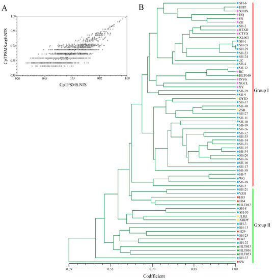 At the same time, according to the amplification results of 26 SSR primers in the 69 samples, after calculating the SM genetic similarity coefficient between the samples, a cluster map was obtained using the unweighted pair-group method with arithmetical means (UPGMA). In order to test the reliability of the clustering results, the Mantel test was carried out through the molecular marker clustering results and the similarity coefficient matrix, and the correlation coefficient r = 0.80 (Figure 7A) was obtained, indicating that the molecular marker clustering results accurately clustered 69 samples with a close genetic relationship into a group. When the similarity coefficient was 0.55, 69 samples were divided into 4 groups (Figure 7B). Group I contained 59 samples. The samples from Sichuan and Nanjing and most of the samples from Shanghai belonged to Group I. Group II contained 8 samples, including 3 samples from Kunming, 3 samples from Shanghai and 2 samples from Wuhan. Groups III and IV 4 contained only one sample, SH-33 and SW, respectively.