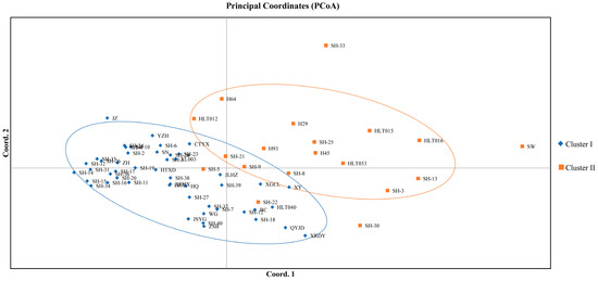 The genetic differences in the population could be inferred via population structure analysis. It is easier to understand the evolutionary relationship between groups and individuals if they are divided into subgroups. Because quantitative characteristics are impacted by complex factors such as genetic variations across populations and individuals, we employed a combination of NJ-tree-building and structural analysis to validate the genetic clustering and population structure of 69 wintersweet cultivars and genotypes (Figure 6 and Figure 7). These wintersweet samples came from the main production areas and germplasm resource nurseries of wintersweet in China. In the structural analysis, 69 wintersweet samples were divided into two clusters. In the phylogenetic analysis, when the similarity coefficient was 0.55, the samples were divided into four groups, of which SH-33 and SW were separated into one group each (Figure 7), which was similar to the PCA analysis results. Meanwhile, we discovered that the two groups intersected each other in the PCA analysis (Figure 8). The result of PCA analysis made up for the defects of the genetic clustering using the genetic similarity coefficient and the population structuring using Bayesian algorithm. Our results indicate that even when genotypes came from the same area, they could be from different original production areas, because they were not specifically clustered into one group. For example, in the structural analysis, two samples from Kunming were in Cluster I, and four samples were in Cluster II (Figure 6); in the cluster analysis, three samples from Kunming belonged to Group I, and the other three samples belonged to Group II (Figure 7). This might have led to the deviation in the results of the genetic clustering and structural analysis. Although the clustering results matched the geographic origin found in an earlier research [56], some people believe that microsatellite analysis cannot be used to cluster species based on their geographic origin [55].