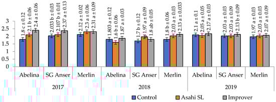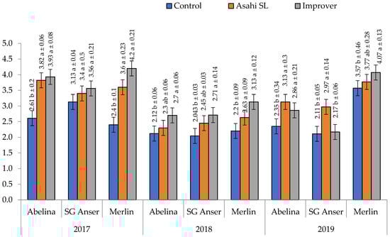 An application of the biostimulant Improver was followed by a significant increase in soybean yield of over 29% (regardless of cultivar) compared with the control, whereas Asahi SL contributed to a 0.7 Mgha−1 yield increase. Moreover, the yield of soybean treated with Improver rose by over 2% compared with Asahi SL (Table 3). The effect of biostimulants on soybean yield performance was affected by growing seasons. Considerable differences between the biostimulants were observed in the first and second study year, when an increase in the yield was recorded following an application of Improver compared with Asahi SL. In 2019, the differences between the test biostimulants were not confirmed (Table 3). An analysis of the three-year results demonstrated a significant interaction between the cultivars and biostimulants, which meant that the test cultivars responded in a different manner to the applied biostimulants. Cv. Abelina and SG Anser produced higher yields compared with control plants, although no differences were confirmed between these cultivars following treatment with Asahi SL or Improver. Unlike these two cultivars, cv. Merlin responded to an application of Asahi SL and Improver, the latter product contributing to a 6% yield increase compared with crops harvested from plots treated with Asahi SL (Table 3). However, the effect of biostimulants on the yield performance of cultivars was much more complicated when their response was considered in the light of growing conditions, as indicated by the interaction years × cultivars × biostimulants (Figure 1). In the wet year 2017, SG Anser was the only cultivar that remained unresponsive to an application of biostimulants. Cv. Abelina and Merlin produced better yields when treated with biostimulants compared with control yields, the yield-forming effect of the test biostimulants being similar. A similar response was observed for cv. Merlin in the dry 2017 and for cv. Abelina in 2019. Under the growing conditions of 2018 and 2019, there were no significant yield changes due to spraying with Asahi SL for cv. Abelina and SG Anser compared with the control, whereas this was true for the year 2019 for only cv. Merlin.