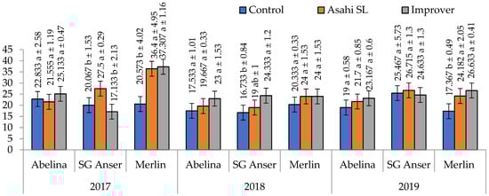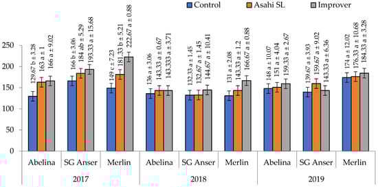 An interaction of cultivars and biostimulants in terms of 1000-seed weight was much more complex when viewed through the prism of growing seasons as confirmed by the significance of the interaction years × cultivars × biostimulants (Figure 2). The impact of biostimulants on TSW was determined in 2017 only. The seeds of cv. Abelina had a lower 1000-seed weight in the control unit compared with Asahi- and Improver-treated plots, there being no significant differences confirmed for cv. Merlin. Improver contributed to an increase in TSW compared with the control or Asahi SL. In the remaining study years, the 1000-seed weight of the test cultivars was similar, regardless of the biostimulant applied.