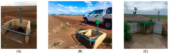 The western field was manually irrigated using pre-existing winch cable-controlled rubber lay-flat stops. Automated outlet controllers—AutowinchSense (Padman Automation, Strathmerton, VIC, Australia)—were installed to the winch cable-controlled rubber flaps and undershot sluice gate outlets on the eastern field. The AutowinchSense devices operated as per the AutowinchPro’s; however, they communicated via CAT-M1 and also measured water height using a calibrated pressure transducer. Images of the automation infrastructure used at Site B are provided in Figure 2.