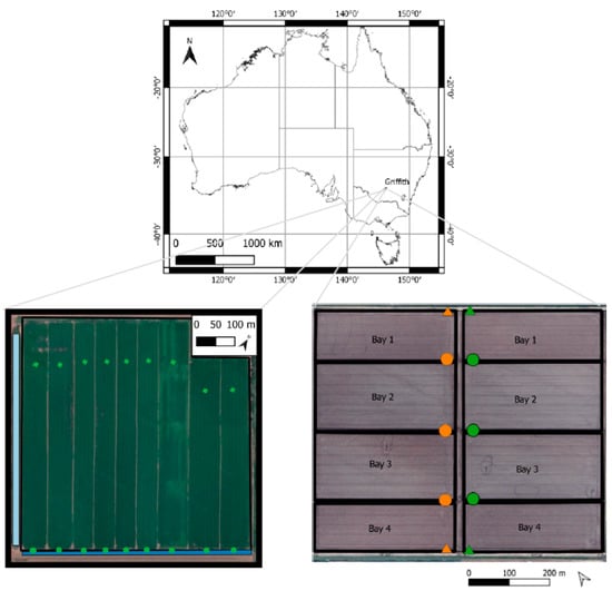 The study was conducted across two commercial rice farms, both near Griffith, NSW, Australia. This temperate rice-growing region typically has hot, dry summers and cool winters, with average in season (October–April) rainfall of 150 mm and evapotranspiration of 1150 mm [].