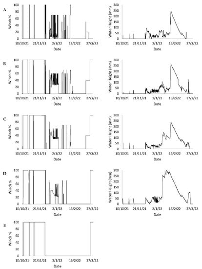 Seasonal outlet position (%) and water height (mm) for each bay at Site B. (A–D) Bay 1–4, respectively, and (E) drain.