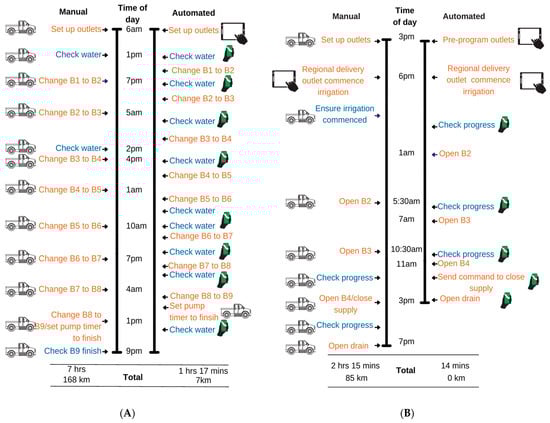 (A) Time and travel associated with manual flush irrigation at Site A. (B) Time and travel associated with flush irrigation of manual and automated fields at Site B. Essential activities are indicated in orange, whilst non-essential water checks in blue. “Water checks” were often occasions when the farmer went to close the inlet of one bay and open the next inlet, but irrigation was not complete and was required to return later.