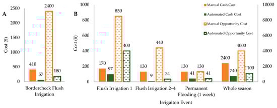 (A) Site A: Cash cost and opportunity cost of manual and automated irrigation. A: Site A, for one flush-irrigation event across the nine-bay field on the left axis. (B) Site B, flush irrigation 1, flush irrigations 2–4 and 1 week of daily check during permanent flooding on the middle axis; the seasonal data is provided on the far-right axis.
