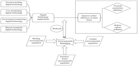 2.2. The Moderating Role of Environmental Regulation in the Effect of Digital Technology Application on Carbon Emission Efficiency in Dairy Farms