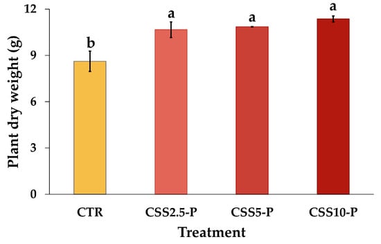 Plant dry weight of lettuce in soil amended with different doses of CSS: control (CTR), 2.5 t ha−1 (CSS2.5-P), 5 t ha−1 (CSS5-P), and 10 t ha−1 (CSS10-P). Different letters indicate significant differences among treatments at p < 0.05.