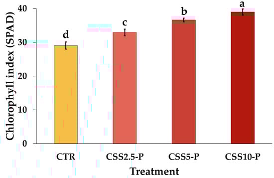 Chlorophyll index (SPAD) of lettuce in soil amended with different doses of CSS: control (CTR), 2.5 t ha−1 CSS2.5-P, 5 t ha−1 (CSS5-P), and 10 t ha−1 (CSS10-P). Different letters indicate significant differences among treatments at p < 0.05.