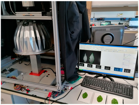 The hyperspectral images were acquired with an industrial camera (CoolSNAP ES, Photometrics, AZ, USA) coupled with two tunable liquid crystal filters (Varispec VIS-07 and NIR-07, Cambridge Research & Instrumentation, Inc., Hopkinton, MA, USA). The camera was configured to acquire images with a size of 1392 × 1040 pixels and a spatial resolution of 0.14 mm/pixel in the operating spectral range of 500–980 nm in steps of 10 nm (49 bands). Each hyperspectral image acquisition captured with this configuration required 40 s. To optimise the dynamic range of the camera, avoid saturated images and correct the spectral sensitivity of the different elements of the system, a calibration of the integration time of each band was performed, capturing the average grey level of a reference white (Spectralon 99%, Labsphere, Inc., North Sutton, NH, USA). Calibration was performed with a threshold of 1%. Hyperspectral images were taken of these 6 leaves (one image per leaf), resulting in 144 images of leaves. The scene was illuminated with indirect light from twelve halogen bulbs (37 W) (Eurostar IR Halogen MR16. Ushio America, Inc., CA, USA) arranged inside a hemispherical aluminium diffuser (Figure 1).