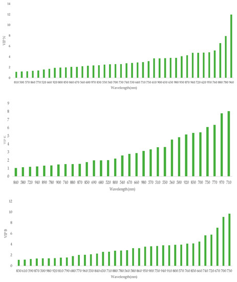 The most important bands were selected for those nutrients with the highest results (R2 > 0.65) in Table 3, which were N, K and B. A method based on the VIP scores was used to select the most important bands to predict the concentration of these nutrients. Figure 2 shows the bands with a VIP score higher than 1 for N (40 bands), K (32 bands) and B (36 bands).
