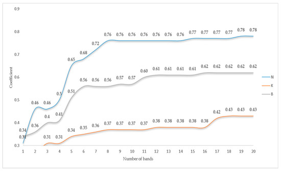 Coefficient R2 obtained by the models as a function of the number of bands used for N, K and B.